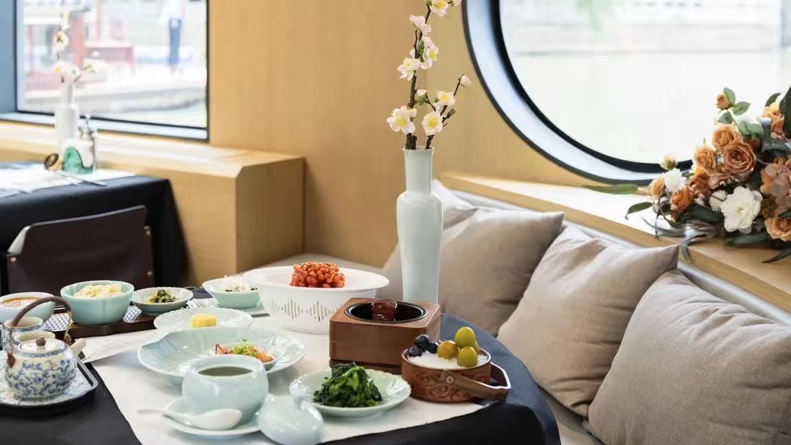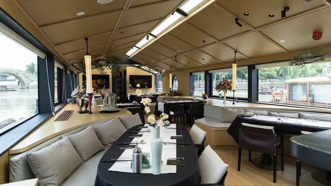 於古運河上展開的移動式饗宴,將蘇州水鄉風情與精緻宴席完美融合。船行水巷之間,窗外是粉牆黛瓦、橋影倒映;桌上則是道道講究的江南佳餚。在緩慢流動的水波與燈影中用餐,不只是吃飯,而是一場專屬於姑蘇的浪漫生活儀式。