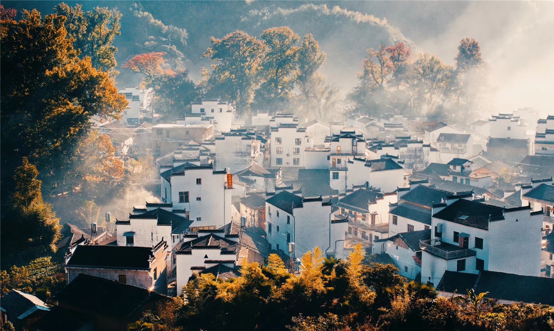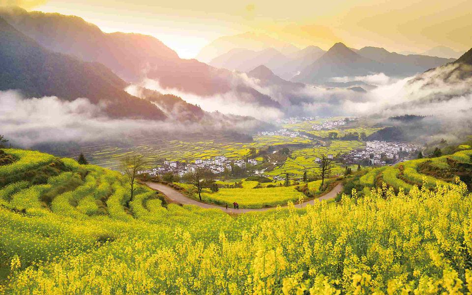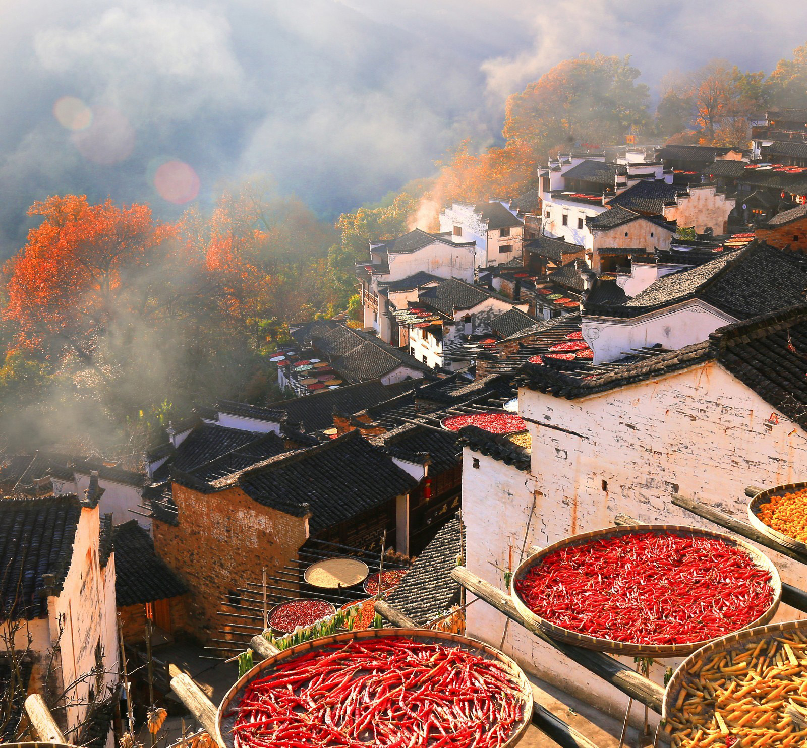 婺源被譽為「中國最美鄉村」,篁嶺景區的層層梯田與金燦燦的油菜花海交織成一幅明亮的田園畫卷。春日裡,微風拂過花海,金浪翻湧,蜂蝶翩翩,生機盎然。古村粉牆黛瓦、馬頭牆錯落有致,曬秋人家屋前屋後掛滿了紅辣椒與金黃的玉米,色彩斑斕,宛如時光凝結的風景。晨霧繚繞時,炊煙裊裊升起,映襯著徽派建築的白牆與黑瓦,構成一幅靜謐而詩意的山水畫。無論漫步於石板巷間,或登高遠眺梯田曲線,都能感受到自然與人文的完美共鳴,體會那份屬於婺源的溫柔與恬靜。