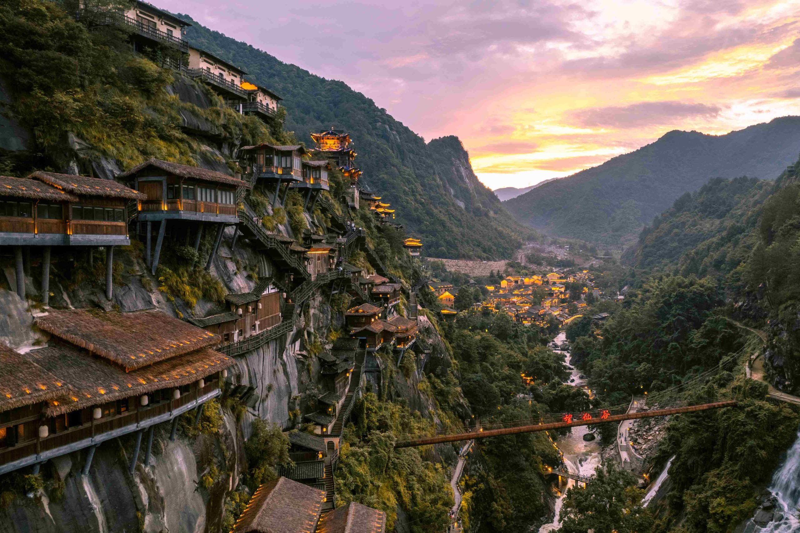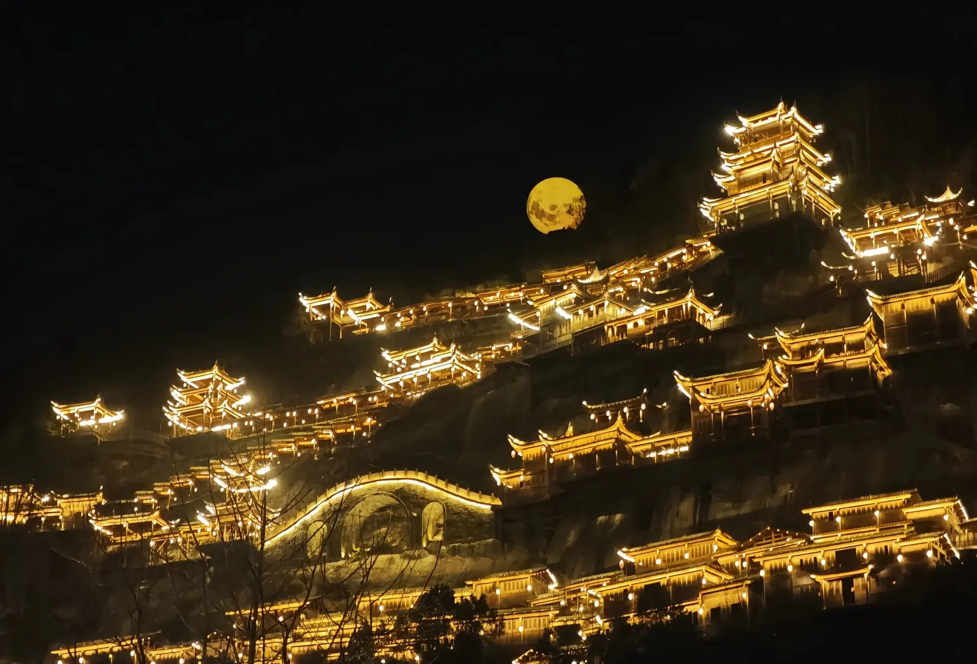 沿著山脈延伸,便可抵達同樣夢幻的望仙谷——一座懸崖上的秘境小鎮。登上青雲橋,腳下雲霧翻湧,遠處飛瀑垂落如銀練;行走尋仙路間,山風吹拂,心境澄明。夜幕下的懸崖燈火璀璨,如星河灑落山谷,詩意與壯麗在此交融。無論是葛仙村的仙氣靈韻,還是望仙谷的壯闊雲海,皆如夢似幻,共同構成一場「行走雲霧之上、夢回仙源秘境」的仙境之旅。