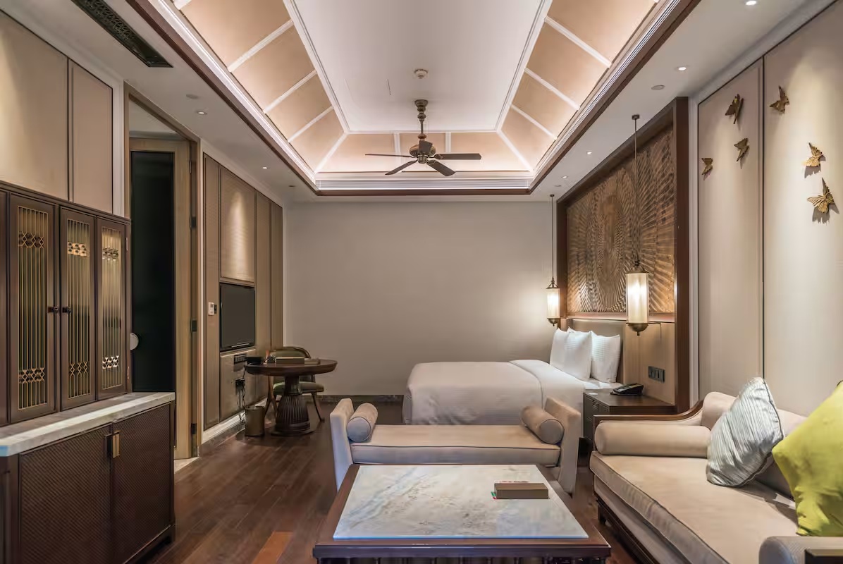 以東方雅奢為核心美學,結合西雙版納熱帶風情與現代度假設計,展現大器而從容的南國氣度。酒店空間開闊,園林、水景與建築層層鋪陳,客房設計溫潤典雅,兼具舒適機能與度假尺度。餐飲呈現中式精緻料理與在地風味,公共空間與休憩設施完善,無論家庭度假或高端團體旅遊,皆能在此享受穩重、舒適且具品味的南方度假生活。