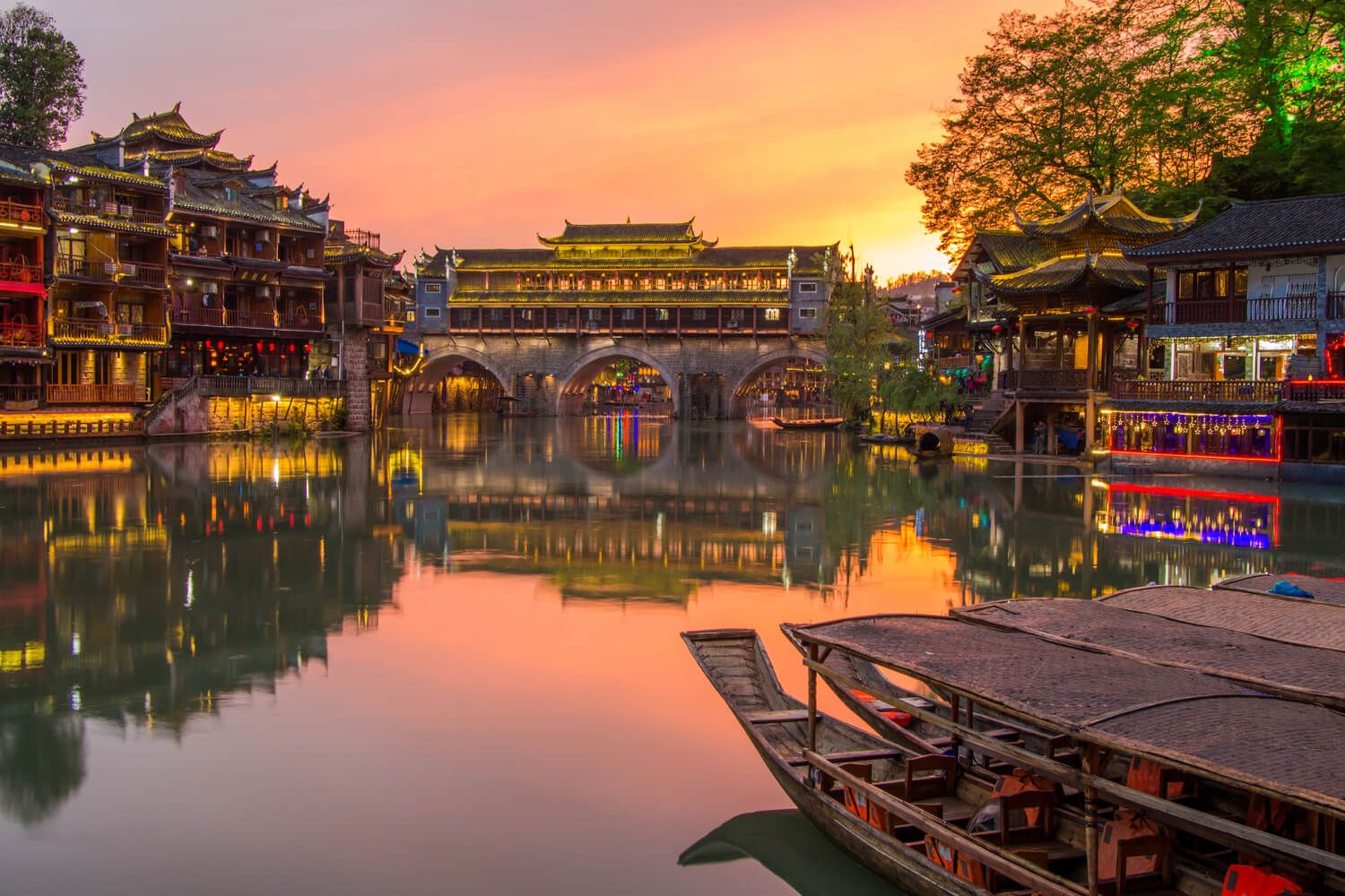 若說湘西是一首詩,那鳳凰古城便是其中最柔軟的一句。白日裡,走訪沈從文故居、崇德堂與沙灣吊腳樓,細讀文人筆下的浪漫古意;夜幕降臨,華燈初上,換上華麗的苗族服飾,乘船悠悠遊於沱江之上,觀虹橋、萬名塔與兩岸吊腳樓倒映水中。微風拂面,水光瀲灩,一座靜謐古城的靈魂在光影之間緩緩展開,讓人流連忘返。