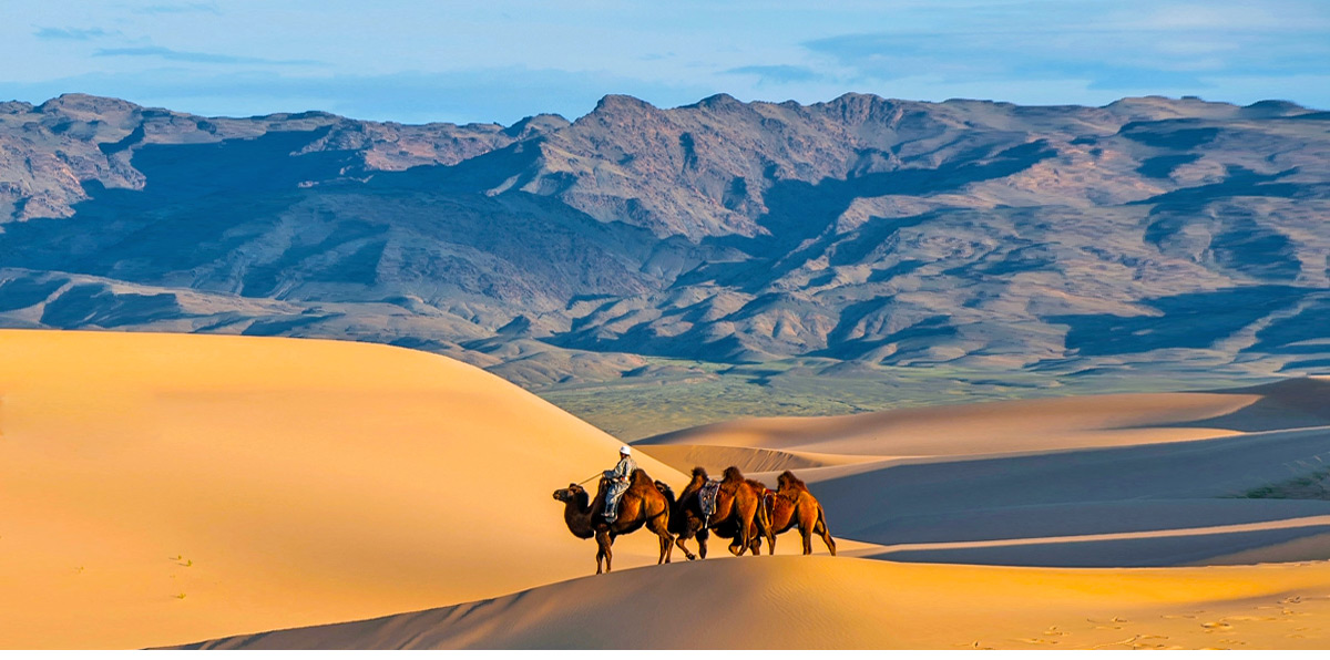 踏上廣袤無垠的戈壁大地,感受最純粹的蒙古風景。此行特別安排騎乘戈壁駱駝,跟隨沙丘邊緣的風聲與駝鈴節奏,慢步走入大漠深處。坐在駱駝寬厚溫暖的背上,遠方山巒如墨、近處砂礫閃光,每一步都像在描繪一幅屬於大地的古老畫卷。駱駝步伐悠緩,讓人更能細細體會戈壁的壯闊與靜謐——那是城市無法複製的寂靜,也是旅人最難忘的沉澱時刻。微風輕拂臉頰,陽光灑落在金色沙丘上,彷彿置身千年前的絲路場景。這趟騎駱駝之旅,不只是體驗,更是一次與自然、歷史和心靈對話的冒險。